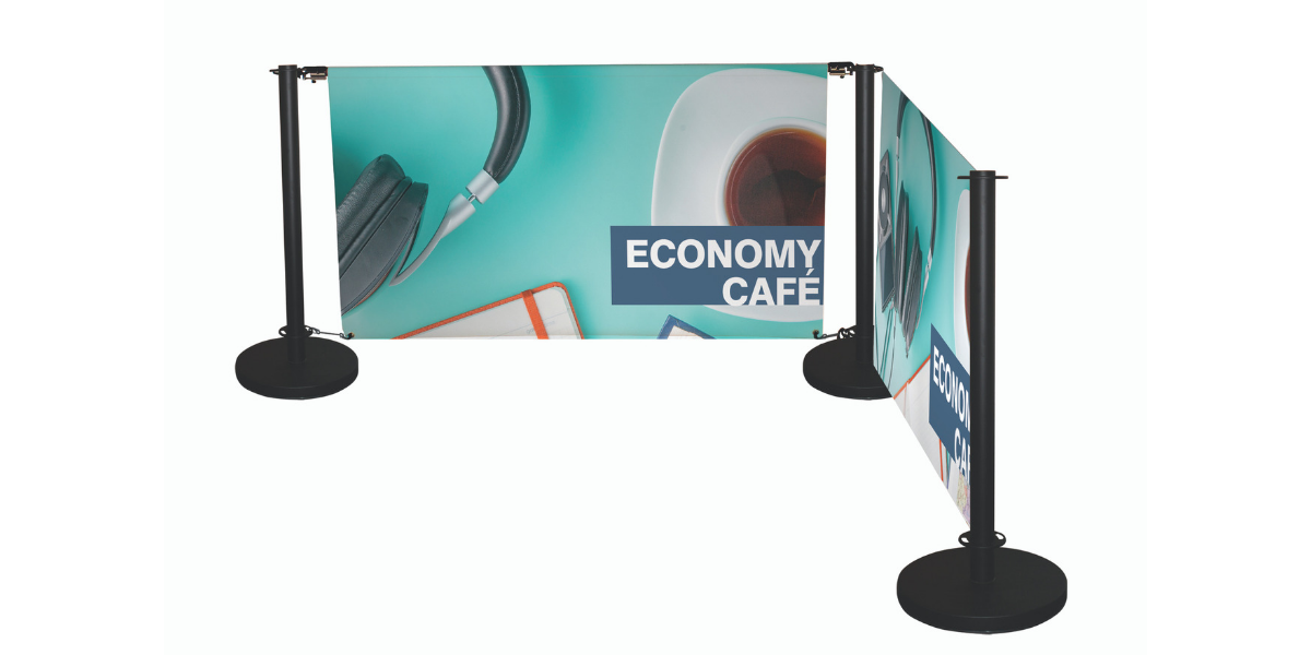Absperrsystem mit Digitaldruck 1500mm - die elegante Art im Innen- und Außenbereich den Weg zu weisen. Eine kosteneffiziente Möglichkeit, Bereiche außerhalb von Restaurants, Bars und Einkaufszentren zu abzusperren. Schwerer Pfosten und Base. Schwarzes Design.