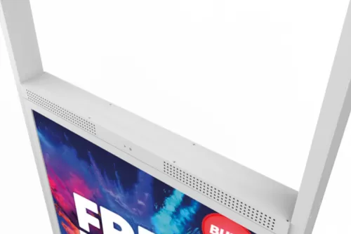 Die doppelseitige Werbebildschirme für Schaufenster mit 43 und 55 Zoll und Decken- Aufhängung, verfügen über zwei integrierte Slimline-Lautsprecher für Anwendungen, die ein Audioelement beinhalten.