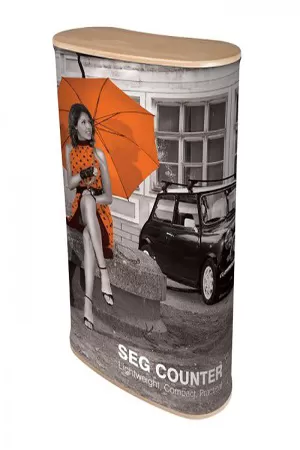 Eine praktische Pop-up Promotiontheke mit Textildruck und Thekenplatte in 5 Farboptionen, um Ihre Kunden zu begrüßen. Die mobile Messetheke wird für den Transport flach zusammengepackt.