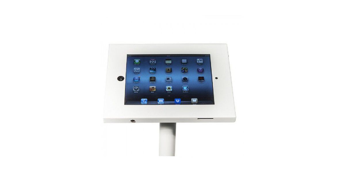 Die freistehende iPad Halterung ist eine geschickte pfiffige Lösung für den Einsatz des iPad 2, 3 oder 4. Das Sichere Gehäuse wird mit Sicherheit Inbusschrauben und Schlüssel geliefert und kann im Hoch- oder Querformat positioniert werden. Für zusätzliche Sicherheit sorgt die Möglichkeit der Befestigung des Fußes mit dem Boden oder Messestand.