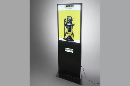 Erhältlich ist unsere LuxLED Leuchtsäule DIN A1 mit einem schwarzen oder silbernen Passepartout. Optional können Sie ein Branding auf der Displayfläche oder