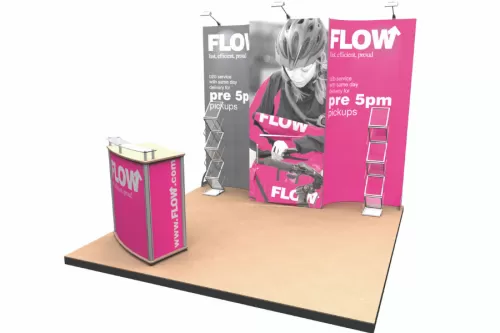 Dieser 3D-Design-Messestand ist ideal für Aussteller, die auf der Suche nach einem kostengünstigen Messestand-Design mit großartiger Grafik sind. Die geraden und geschwungenen Druckpaneele bieten ungewöhnliche mehrdimensionale Grafiken, die durch die Beleuchtung in Szene gesetzt werden.